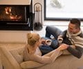 Couple drinking coffee on couch with fire in fireplace