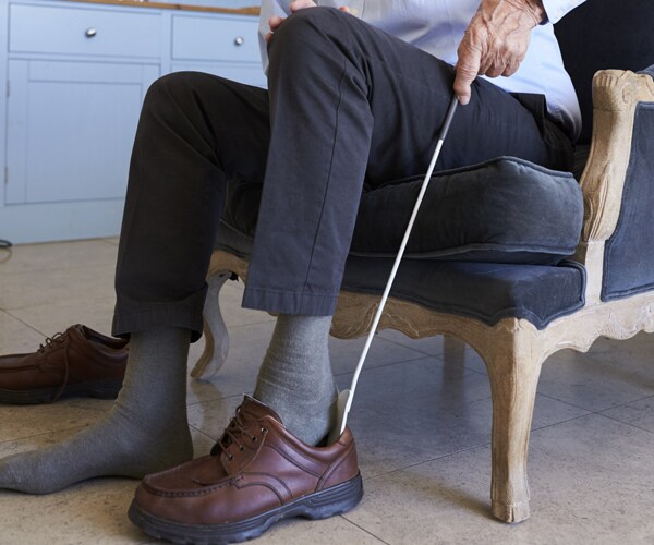 According to Harvard Health Publishing, people with limited movement might have an easier time using long-handled hooks when putting on socks and long-handled shoehorns for shoes.