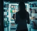 woman looking into refrigerator at night