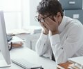 man at desk at work rubbing eyes, stressed