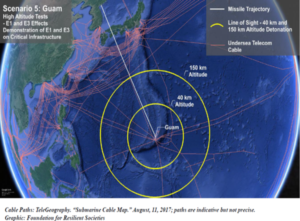 The 150 kilometer altitude test scenario in the South Pacific would threaten not only the infrastructure on Guam, including key military infrastructure, but also vulnerable undersea cables upon which commerce in the entire Pacific region depends.