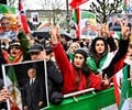 Demonstrators as they display the opposition Iranian Lion and Sun flag, and images of Reza Pahlavi, son of the last shah of Iran, Israel's Prime Minister Benjamin Netanyahu and U.S. President Donald Trump, during a demonstration in support of Iran's freedom - Stockholm, Sweden - March 14, 2026. (Anders Wiklund/TT News Agency/AFP via Getty Images)/Sweden OUT.