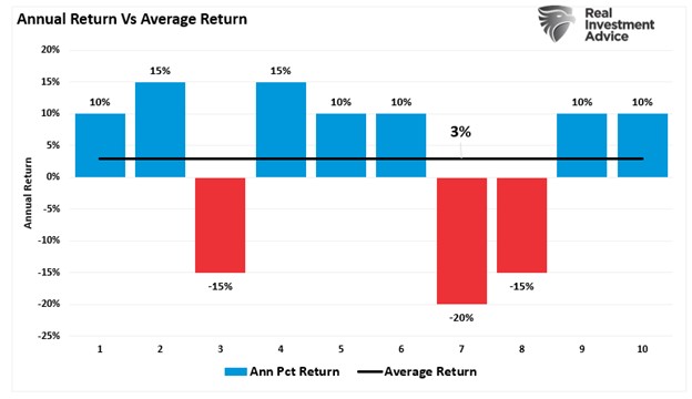 However, here is the crucial point. High valuations do NOT mean that every year going forward over the next decade will experience a low return. It means the “average” return over the next decade will be low. The chart below shows hypothetical annual market returns with a 10-year average of just 3%. Notice that while 70% of the years provided a return of 10% or more, the 30% of the years with negative returns dragged the average substantially lower. This is the problem of market declines and time.
