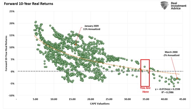 However, where valuations matter is in the long term. Historically, over a decade or more, future returns tend to be lower when stock prices are high relative to earnings. Metrics like the price-to-earnings ratio or P/E ratio often measure such. Conversely, when valuations are low, future returns tend to be higher. The scatterplot chart below compares valuations and returns over a rolling 10-year period.