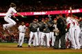 Bearded right-fielder Jayson Werth is first up. The count is 3-2. St. Louis pitcher Lance Lynn is throwing 98-mph bullets and Werth is on his 13th pitch, after hitting seven out of eight foul balls. And then . . . swing . . . crack . . . line drive . . . it’s heading to the left field wall . . . it’s going . . . going . . . SEE YOU LATER! A walk-off home run for Werth.