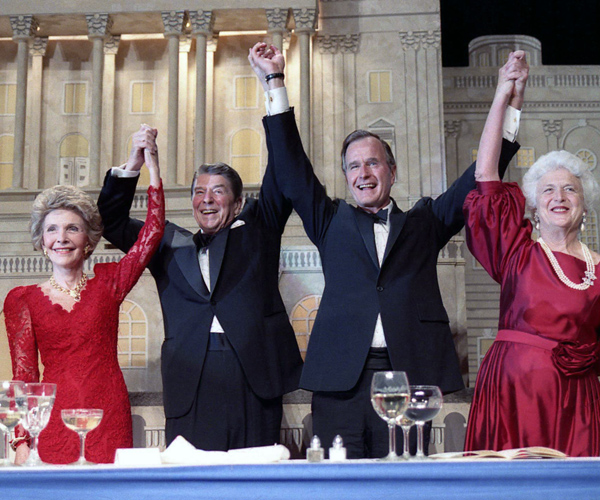 President Ronald Reagan (2nd L) and Vice President George Bush, (2nd R), accompanied by wives Nancy (L) and Barbara, join hands after the president endorses Bush's run for the presidency during the President's Dinner in Washington, D.C., in this May 11, 1988 handout photo obtained by Reuters November 30, 2012. (George Bush Presidential Library and Museum via Reuters)