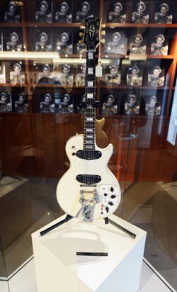 A 1950's Gibson Les Paul white guitar is displayed earlier this month. Gibson Guitar Corp. was raided last August by a federal SWAT team that seized wood from India.