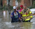 A member of the St. George Fire Department assists residents as they wade through floodwaters from heavy rains in the Chateau Wein Apartments in Baton Rouge, La. (AP Photo/Gerald Herbert)