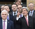 Secretary of State John Kerry gestures while posing with Russian Ambassador to France Alexander Orlov, left, as they take part with other foreign ministers and representatives in a family picture during a Mideast peace conference in Paris on Sunday. (Bertrand Guay/Pool Photo via AP)