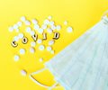 surgical masks, covid spelled out and two different types of pills