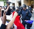 Police wearing riot gear stood their ground for about 90 minutes as violence escalated before breaking up scuffles and making arrests.