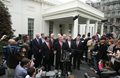 The heads of some of the biggest US banks gather for a press conference outside the White House after a 2009 meeting with President Barack Obama. John Stumpf, center, CEO of Wells Fargo, is at the microphone. (Mark Wilson/Getty Images)