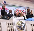 Members of the Harlem Globetrotters celebrate after ringing the opening bell at the New York Stock Exchange during morning trading, Feb. 23, 2024. (Michael M. Santiago/Getty Images)