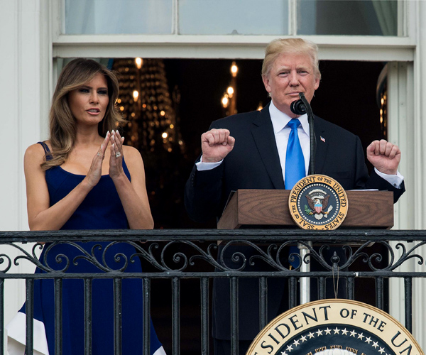 005_Fireworks-_GettyImages-808375570.jpgPresident Donald Trump pumps his fists after speaking as first lady Melania Trump applauds during the military families picnic at the White House in Washington, DC, on July 4, 2017. (Nicholas Kamm/AFP/Getty Images)