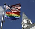 A gay pride flag flies with the American flag outside a church in Kansas. (Charlie Riedel/AP)