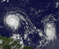 A picture made available by the satellite project East of the U.S. National Oceanic and Atmospheric Administration shows Hurricane Irma at left near Puerto Rico and Hurricane Jose over the Atlantic earlier this week. Jose has gained strength and is now a Category 4 storm. (AP)