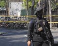 Shattered glass and chunks of concrete littered the entrance of the Santa Maria Church, which was sealed off by heavily armed police. Rescue personnel treated victims on a nearby field while officers inspected wrecked motorcycles in the parking lot that had been burned in the explosion.
