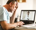 a man buries his head in his left hand while on a video conference with his smiling doctor