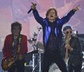 British rock band The Rolling Stones' singer Mick Jagger, center, guitarists Keith Richards, right, and Ron Wood perform during a concert in Gelsenkirchen, western Germany. (Ina Fassbender/AP/2022 file)