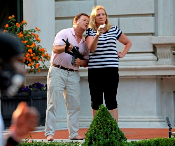 Patricia McCloskey and her husband, Mark, face felony charges for pointing guns at a crowd of people who broke down a gate to get onto their private street in St. Louis.