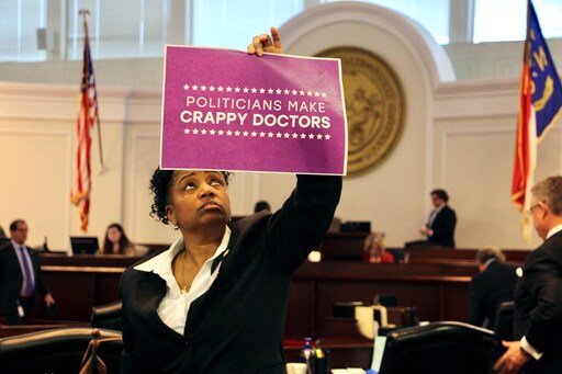Batch and others also pointed to provisions of the bill that would make it harder to get abortions within the new legal time frame. They cite, for example, the requirement for women to make an in-person visit to a medical professional at least 72 hours beforehand. Under current law, the three-day waiting period can be initiated over the phone. The bill would also require a doctor to schedule a follow-up visit for women who have a medically induced abortion, increasing the hardship for those who travel to North Carolina from out of state.