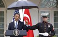 The president spoke at a rainy Rose Garden news conference with Turkish Prime Minister Recep Tayyip Erdogan. As drizzles gave way to a steady rain, Obama summoned Marine guards to provide umbrellas for Erdogan and himself, joking, "I've got a change of suits but I don't know about our prime minister."