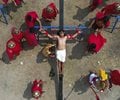 Ahead of their crucifixion on a dusty hill, Enaje and the other devotees, wearing thorny crowns of twigs, carried heavy wooden crosses on their backs for more than a kilometer (more than half a mile) in the scorching heat. Village actors dressed as Roman centurions later hammered 4-inch (10-centimeter) stainless steel nails through his palms and feet, then set him aloft on a cross under the sun for about 10 minutes.