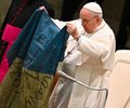 Francis said the darkened and stained flag, which had writing and symbols on it, was brought to him from Bucha on Tuesday.