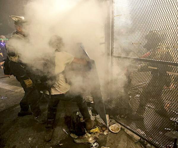 As the clouds of gas floated down the street, protesters would swiftly regroup and return to chant and shake the fence that separates the people on the street from federal agents and the courthouse.