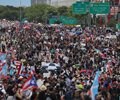 The crowd surged along the American Expressway despite the punishing heat — toddlers, teenagers, professionals and the elderly, all dripping in sweat and smiling as they waved Puerto Rico flags large and small and hoisted signs.