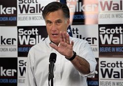 Mitt Romney speaks with supporters of Gov. Scott Walker during a March campaign stop.