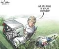 Michael de Adder posted the cartoon on his Twitter account on June 26. In it, Trump is standing next to his golf cart and holding a golf club. As he looks down at the two bodies, he asks, "Do you mind if I play through?"