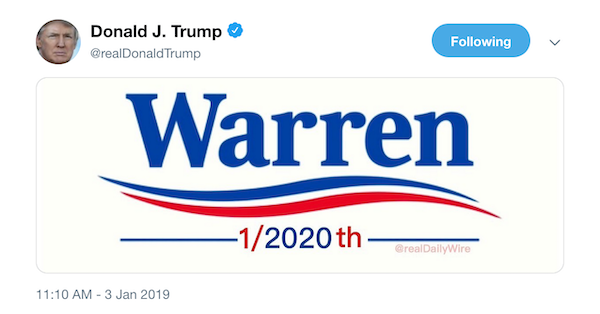 Trump tweeted a mocked-up presidential campaign poster for Warren. The red, white and blue poster read: “Warren” on the first line. Underneath her name was 1/2020th.”