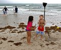 Jack Postupack, 7, right, teases Georgia Black, 8, as he holds a broken oar while playing on the beach, Sunday, Sept. 2, 2018, in Miami Beach, Fla. Weather forecasters have issued storm warnings for portions of South Florida and the Florida Keys. (Carl Juste/Miami Herald via AP)