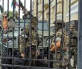Servicemen of the Wagner Group military company guard an area at the headquarters of the Southern Military District in Rostov-on-Don, Russia, June 24. (AP)