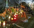 a woman attends to a makeshift memorial and candle light vigil for the astroworld festival victims