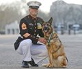 Gunnery Sgt. Christopher Willingham with US Marine dog, Lucca. The 12-year-old German Shepherd completed more than 400 missions in Iraq and Afghanistan over six years. She lost her leg when an IED exploded. (AP Photo/Frank Augstein)