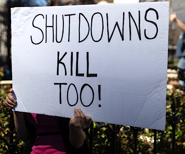 The protest, dubbed "A Day of Liberty San Diego Freedom Rally," featured people carrying American flags and signs that read, "Open California" and "COVID is a Lie." Most were not following social distancing orders or wearing masks.