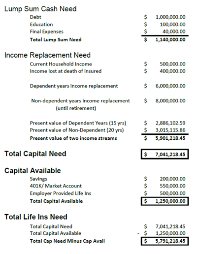 Consider a case for a family of a husband who is 40 and a wife who is 35, looking for a life insurance policy on the husband. Their debts, education expenses and end-of-life expenses total $1,140,000. Dependent year income replacement for 15 years would need to be $6 million. Non-dependent years until retirement would need to be $8 million. A present value calculation for both the Dependent years and Non-Dependent years at a return rate of 5 percent would be $5.9 million. Therefore, the capital need which is the debts, education, and end-of-life expenses plus the income replacement need would be a total of approximately $7 million. Subtract the family’s current capital on hand (savings, 401k, and employer-provided life insurance) of $1.25 million from the total need to cover debts and income replacement and you’re left with a $5.8 million total life insurance need.