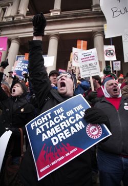 Pro-union supporters protest Michigan's right to work law on Tuesday.