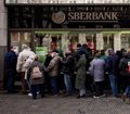 People queue outside a branch of Russian state-owned bank Sberbank to withdraw their savings and close their accounts in Prague on Feb. 25, 2022, the day after Russia first declared war on Ukraine and when Sberbank closed all its branches in the Czech Republic. (Getty Images)