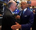 New York Mayor Eric Adams meets trader Joe Dente, left, on the floor of the New York Stock Exchange after Adams was interviewed on CNBC, June 27, 2025. (Richard Drew/AP)
