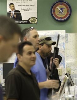 A poster showing Barack Obama is seen in the background as customers line up at a gun shop in Fort Worth shortly after the 2008 election.