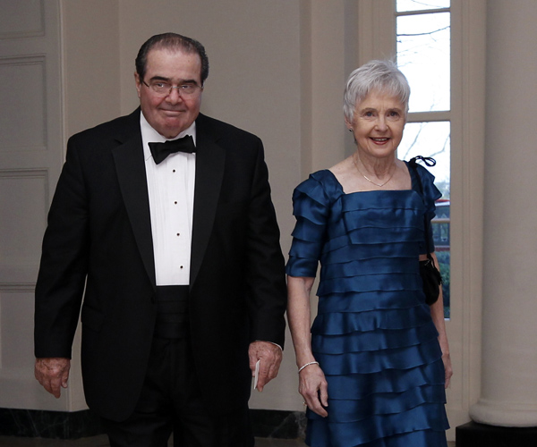 Supreme Court Justice Antonin Scalia and his wife Maureen arrive at the Booksellers area of the White House in Washington for the State Dinner hosted by President Barack Obama and first lady Michelle Obama for British Prime Minister David Cameron and his wife Samantha, Wednesday, March 14, 2012. (AP Photo/Charles Dharapak)