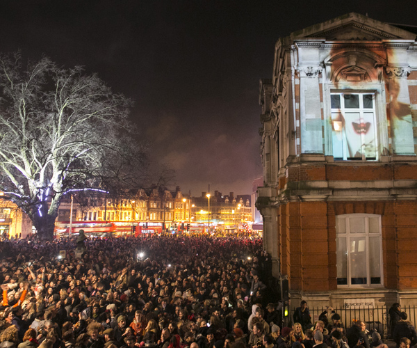 Members of the public gather outside the Ritzy Cinema in Brixton to pay tribute to David Bowie on January 11, 2016 in London, England. (John Phillips/Getty Images)