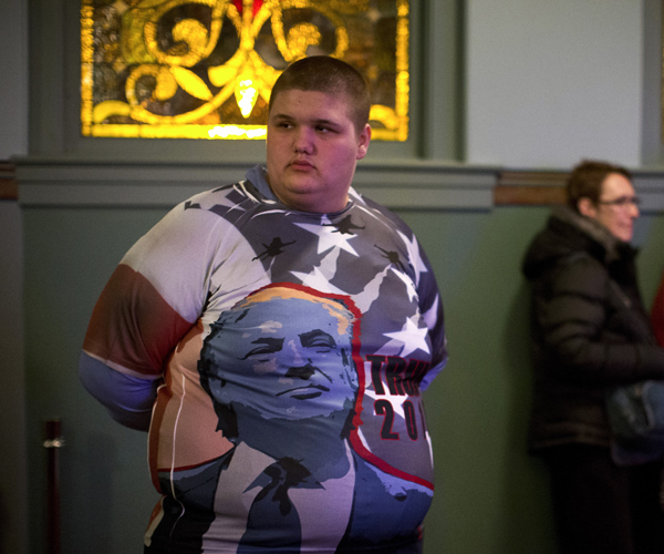 Harley Stone, 16, left, wears a shirt to show his support for Republican presidential candidate Donald Trump, before the start of a campaign event on the campus of Drake University Thursday, Jan. 28, 2016, in Des Moines, Iowa. (AP Photo/Jae C. Hong)
