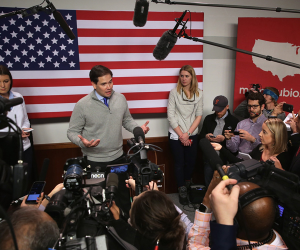 Republican presidential candidate Sen. Marco Rubio talks to members of the news media following a campaign town hall event at the New Hampshire Institute of Politics at St. Anselm College on February 4, 2016, in Manchester, New Hampshire. (Chip Somodevilla/Getty Images)