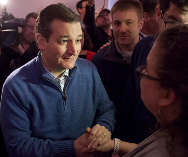 Republican presidential candidate Ted Cruz speaks to a supporter following Cruz's talk on addiction at the Emmanuel Baptist Church on February 4, 2016, in Hooksett, New Hampshire. (Matthew Cavanaugh/Getty Images)