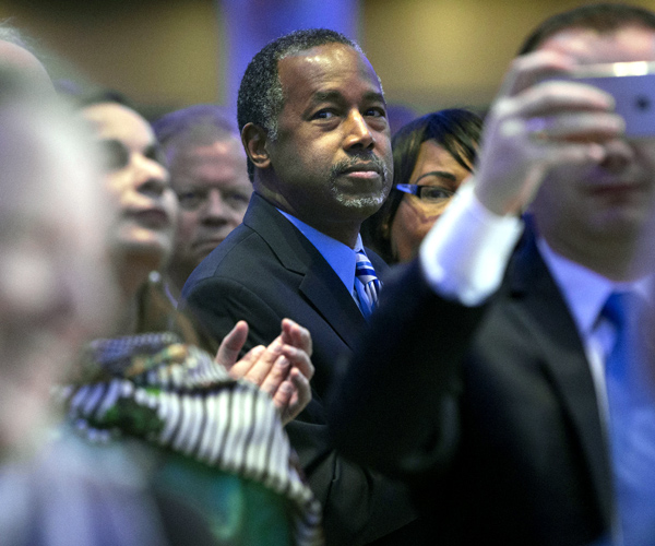 Republican presidential candidate Ben Carson, center, and his wife Candy Carson, stand up to applaud the arrival of President Barack Obama and first lady Michelle Obama at the National Prayer Breakfast in Washington on Thursday, Feb. 4, 2016. (AP Photo/Pablo Martinez Monsivais)