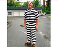 Dressed in a black-and-white striped prisoner’s jumpsuit with a matching beanie, Lowe showed up to court only to be